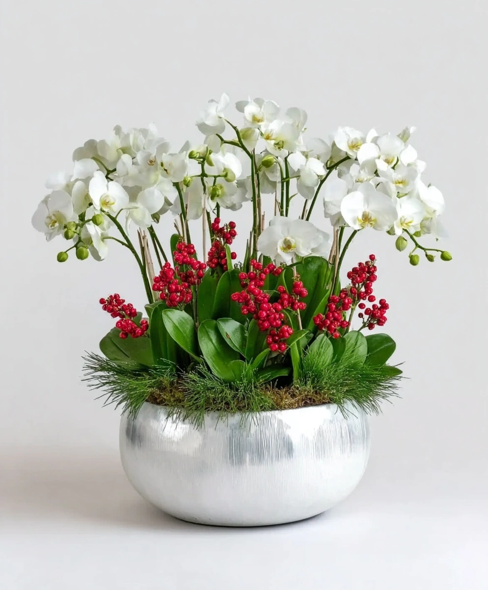 The ‘Holiday Radiance: 10 Mini Orchids’ is more than just a decorative planter—it’s the perfect gift for loved ones or colleagues during the festive season. Its timeless design makes it suitable for various occasions, from Christmas celebrations to elegant winter gatherings. The long-lasting nature of the orchids also ensures that it continues to bring joy long after the festivities have ended, making it a cherished reminder of holiday warmth and cheer.