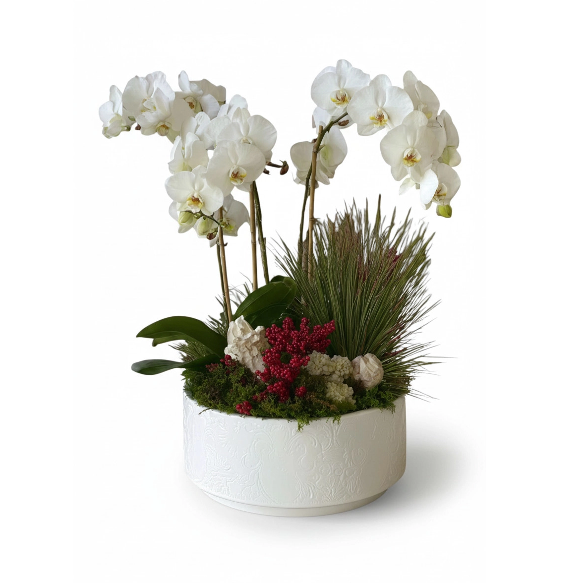 Known for their effortless beauty and remarkable longevity, the Phalaenopsis orchids in this arrangement promise lasting enjoyment. Carefully curated for their pristine white appearance and delicate shape, they require minimal maintenance—allowing you to appreciate their serene splendor throughout the winter and beyond. Perfect for busy individuals who value elegance without added effort, this arrangement offers both visual appeal and practicality.